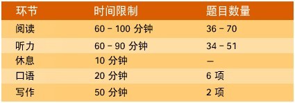 托福考试一共120分,考试全部采用英语,分为阅读、听力、口语和写作四个环节。每环节30分,考试时间总共4小时30分钟。同时,美国的大学对学生托福网考成绩有一定的要求,一般需要达到80-95分。